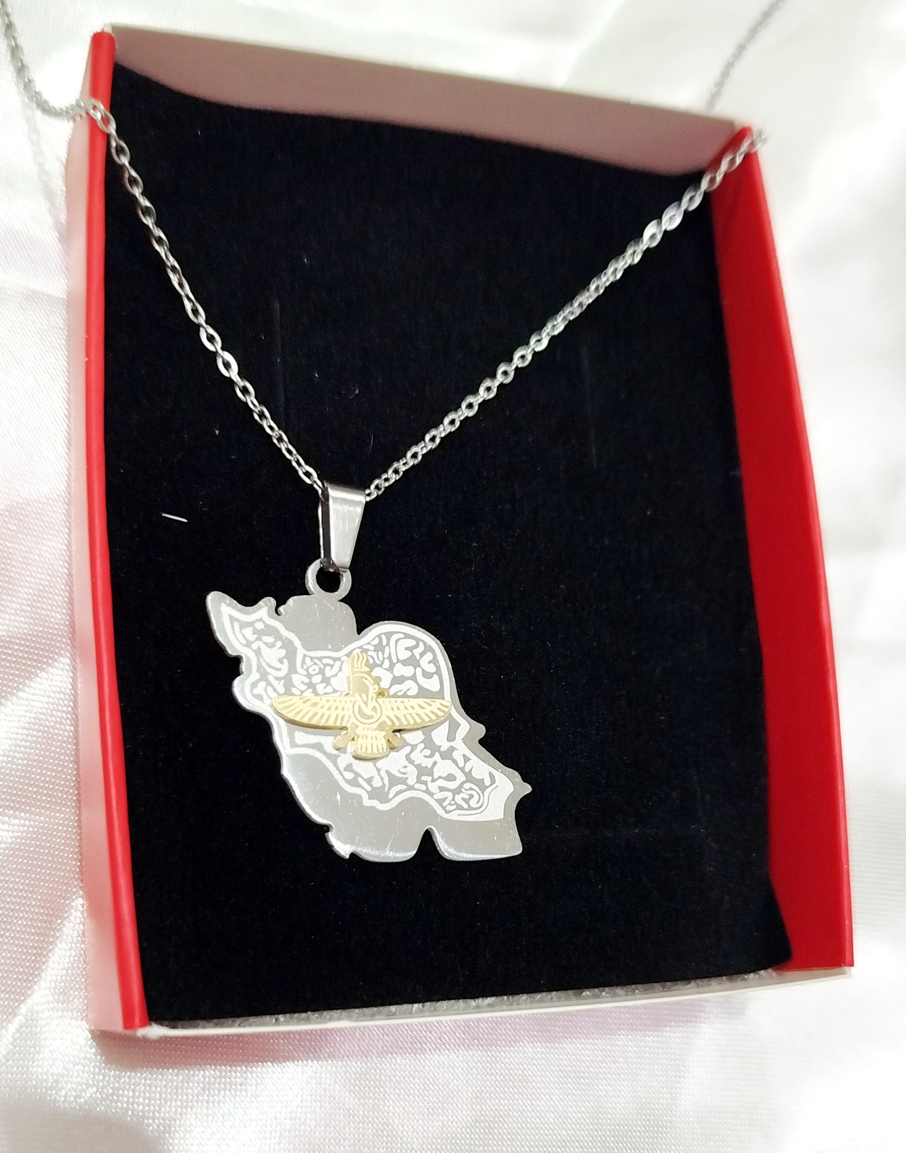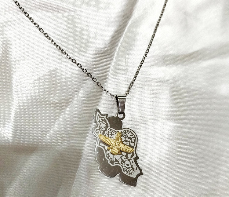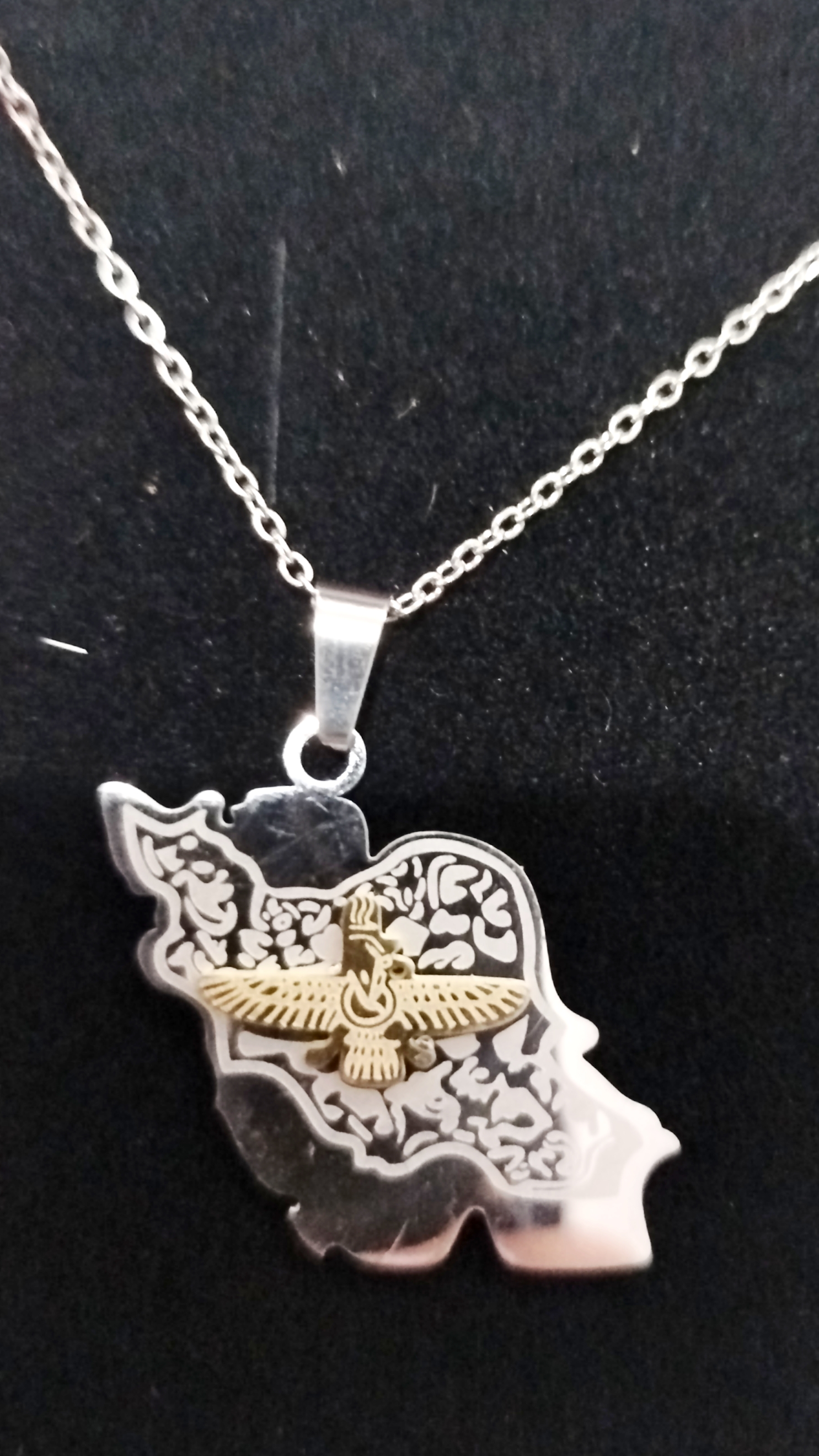 گردنبند نقشه ایران با نماد فروهر استیل آبکاری طلا و نقره رنگ ثابت ضد حساسیت و آلرژی بهترین متریال کیفیت عالی و ضمانت رنگ ثابتی از برند میگااکسسوری