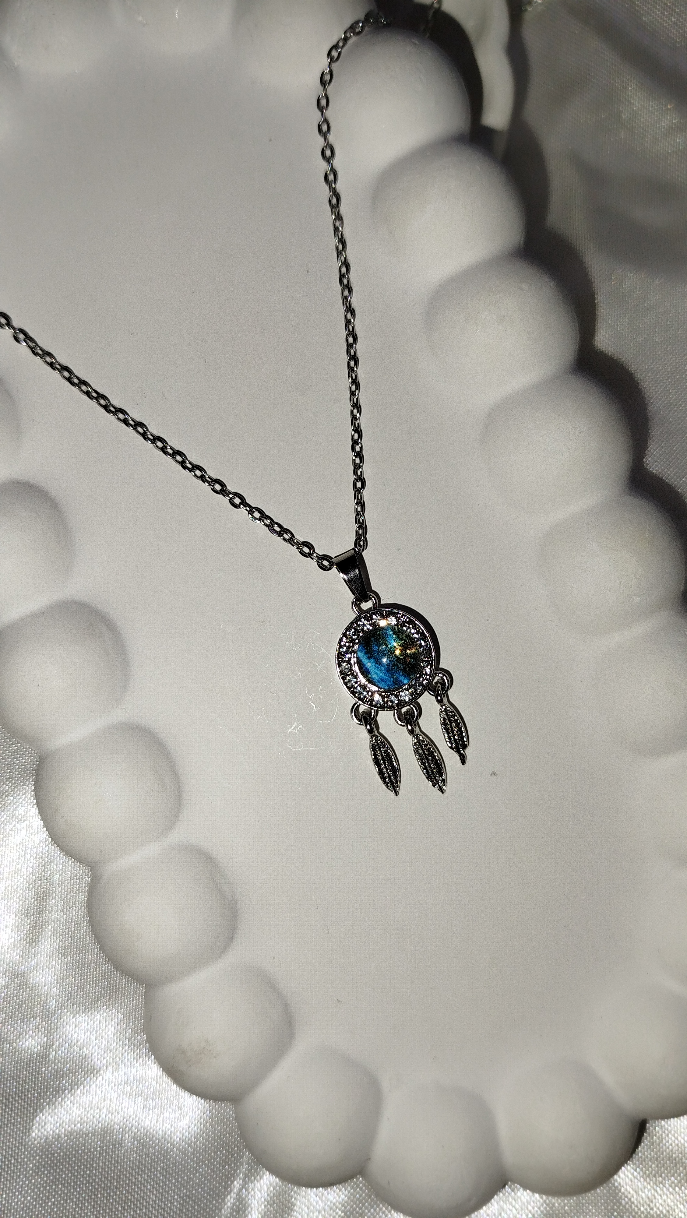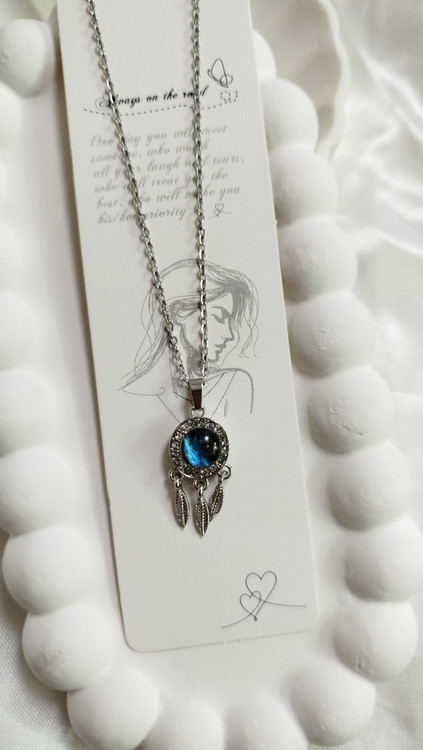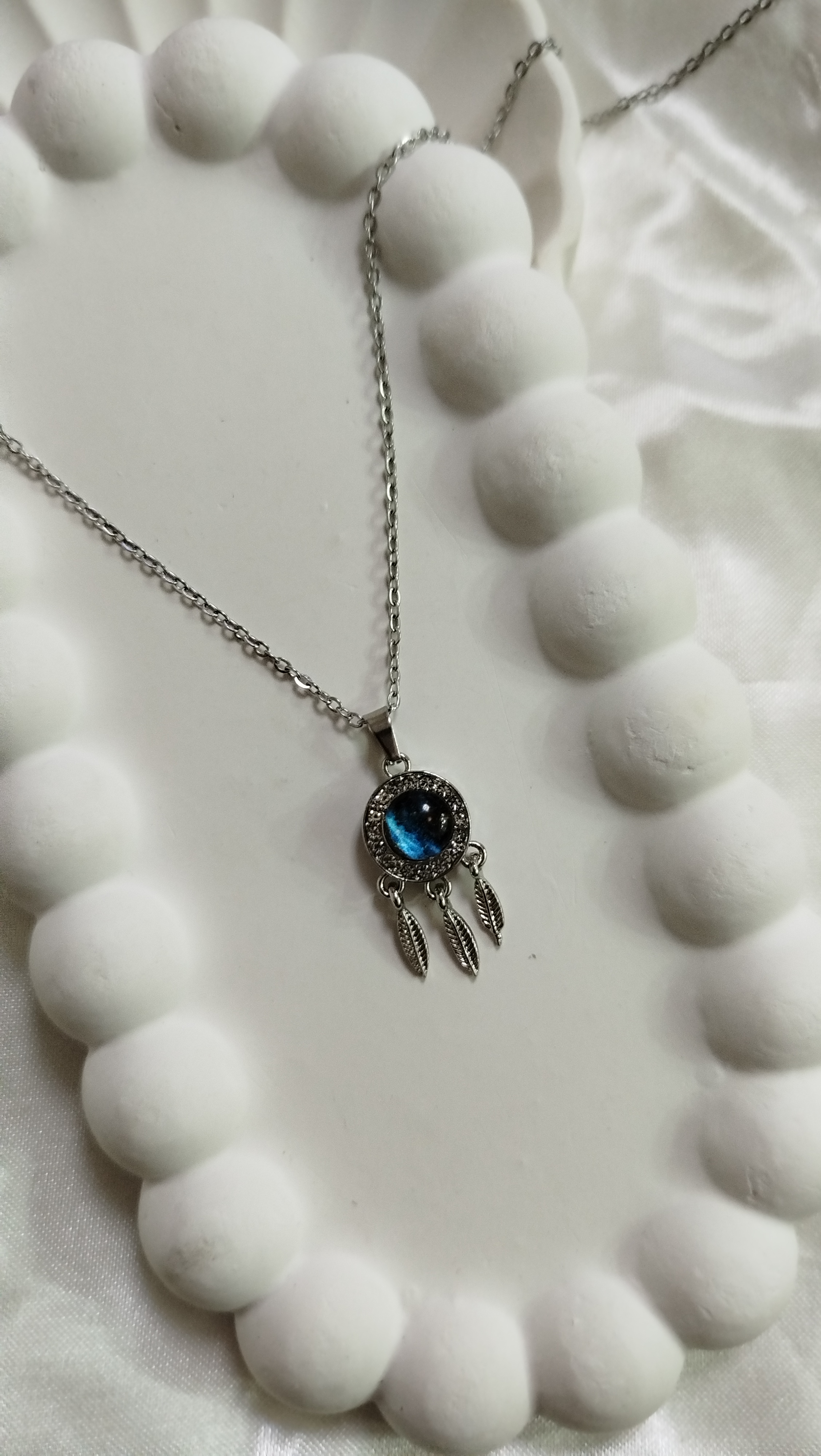 🌿 پلاک با طراحی ظریف دایرهای و آویز پر، الهامگرفته از سبک بوهو و خاصپسند