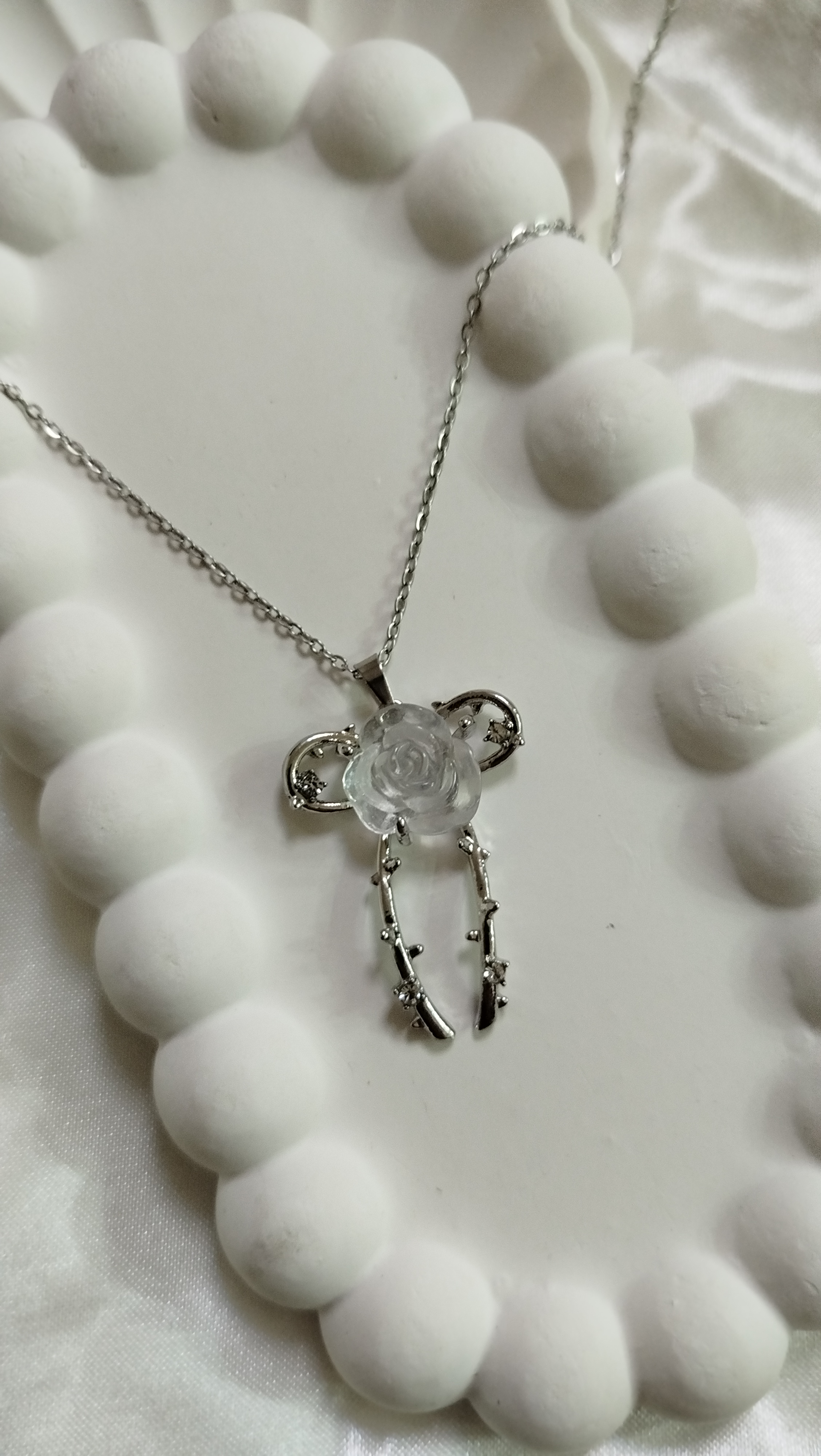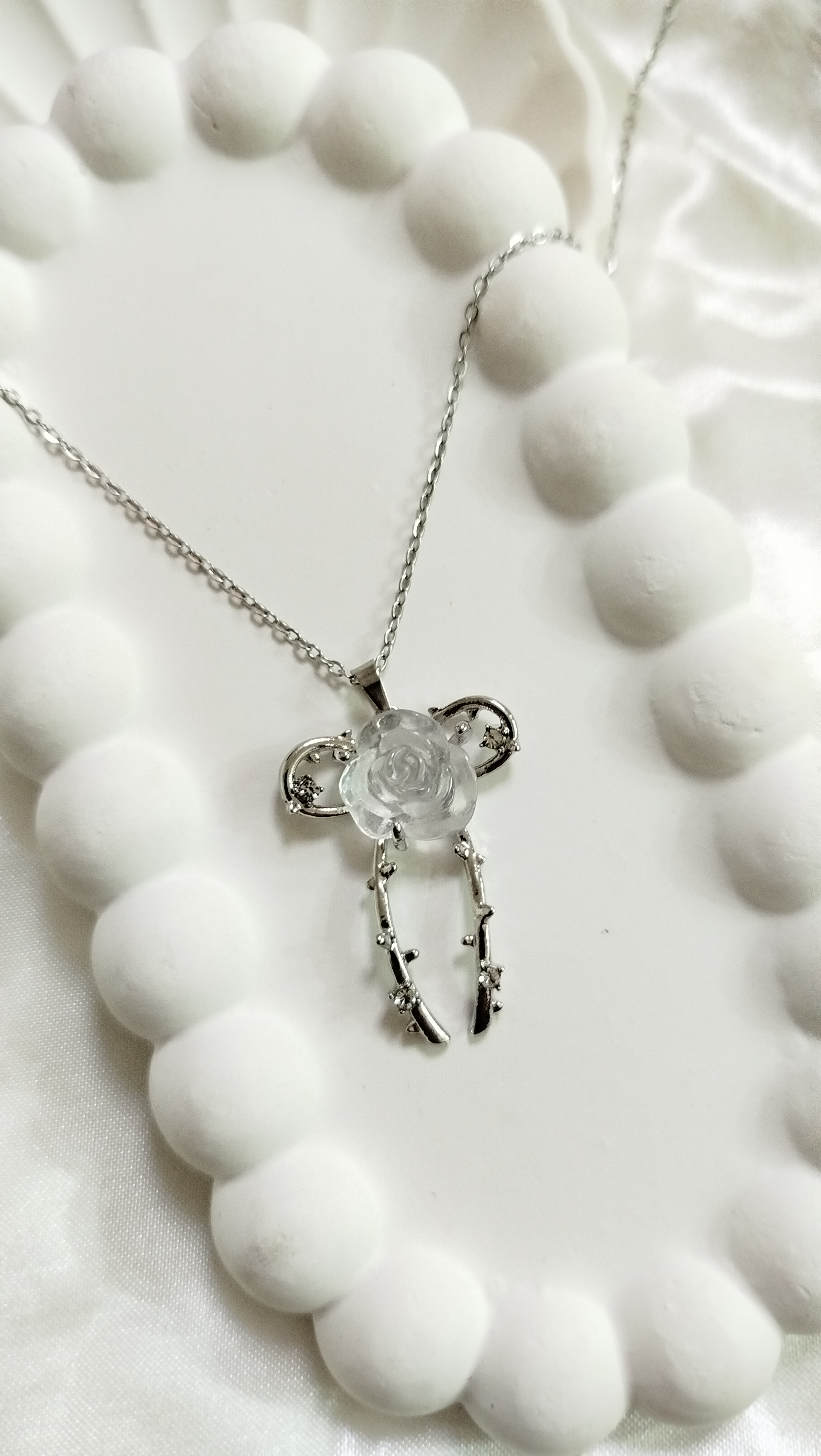گل رز سنگی سفید با برش زیبا و درخشش چشمنواز، جلوهای لطیف و رمانتیک به استایل شما میبخشد 🌹✨