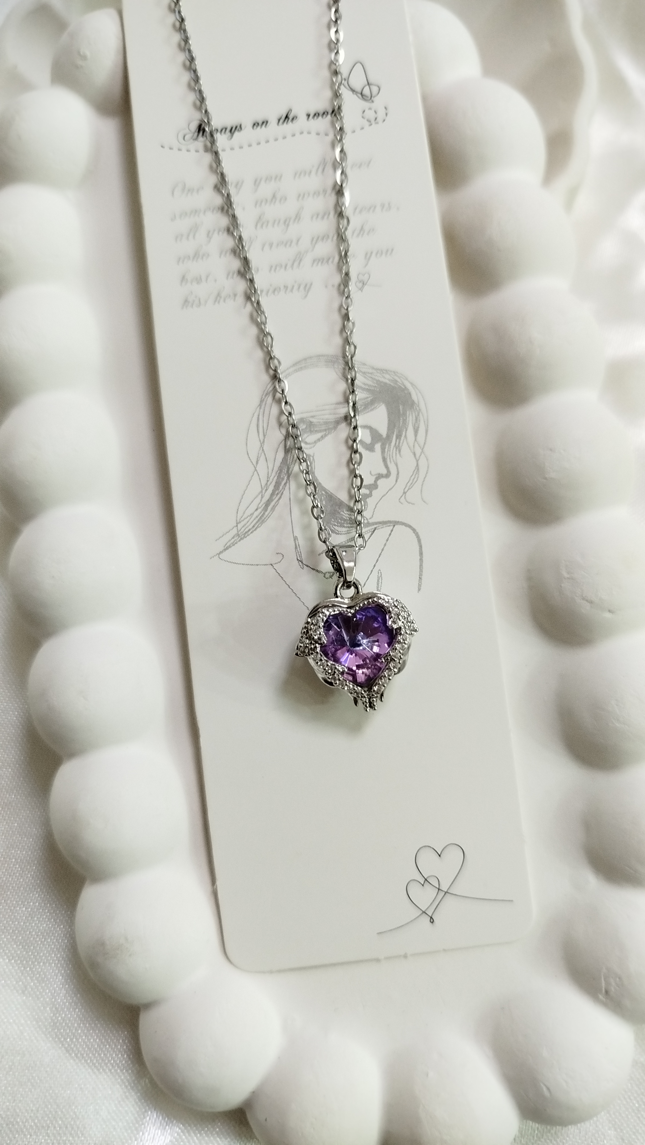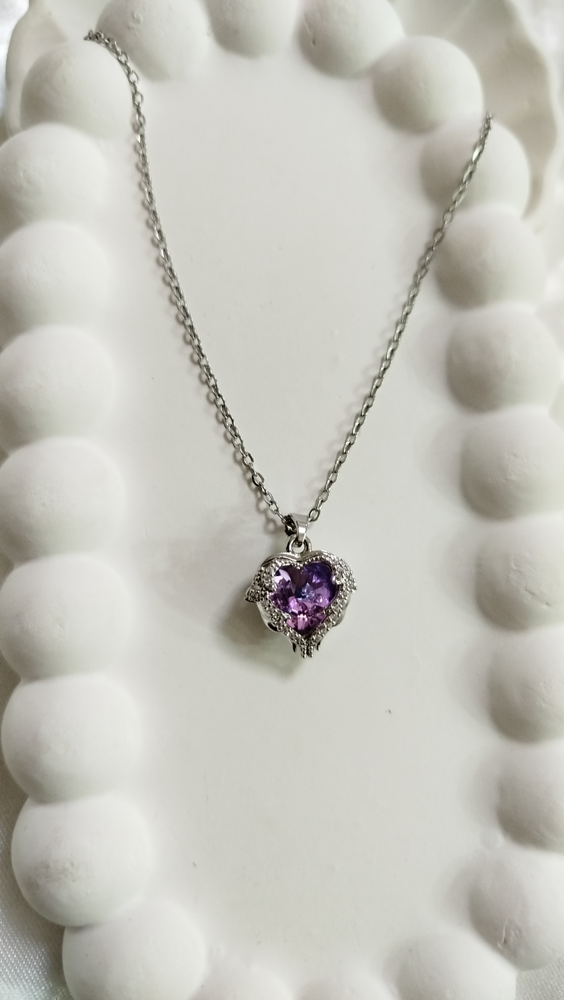 پلاک گردنبند جادو استیل قلب فرشته بالدار با نگین یاسی درخشان از برند سواروسکی اصل طرح مینیمال فانتزی پینترستی نماد آرامش ، وفاداری و محافظت زنجیر دیپلمات استیل نقرهای
