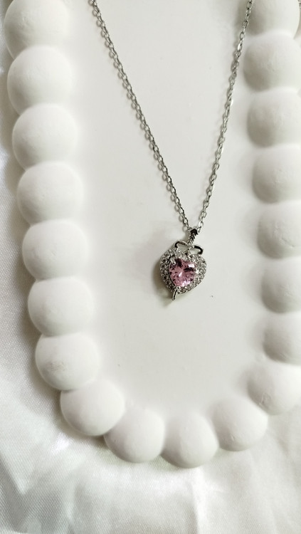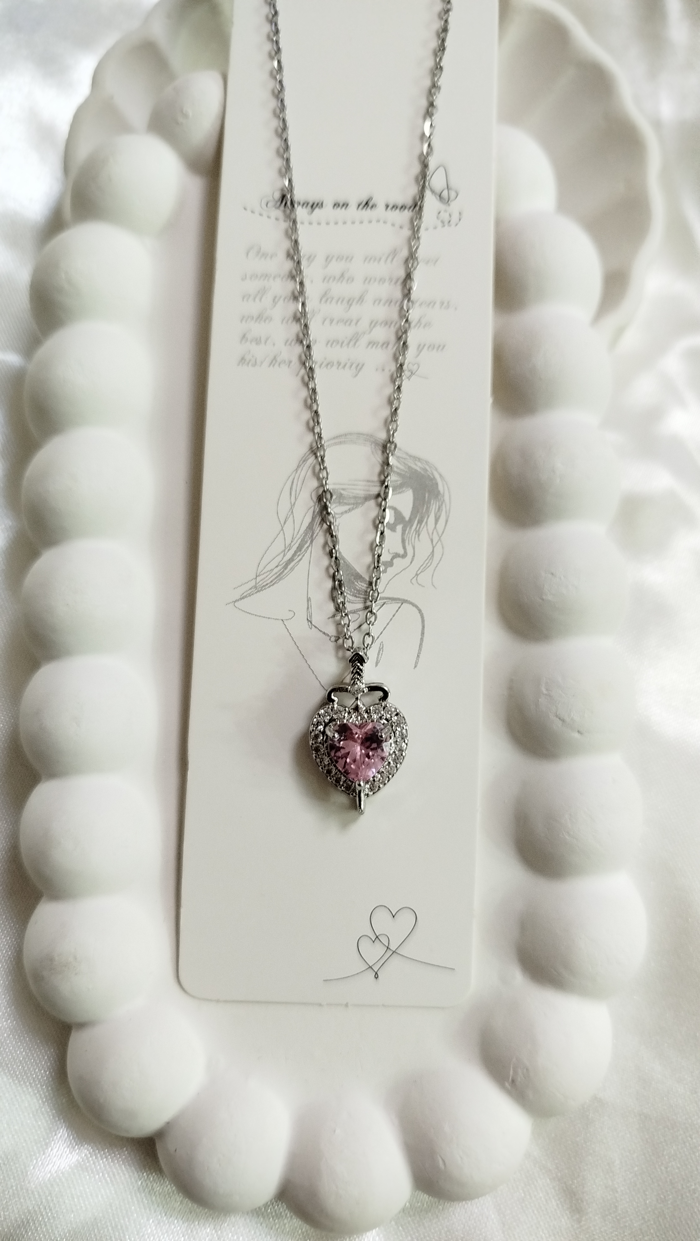 پلاک گردنبند شمشیر در قلب استیل نگین دار با نگین صورتی قلبی از برند سوارسکی اصل طرح مینیمال فانتزی پینترستی زنجیر دیپلمات استیل نقره‌ای