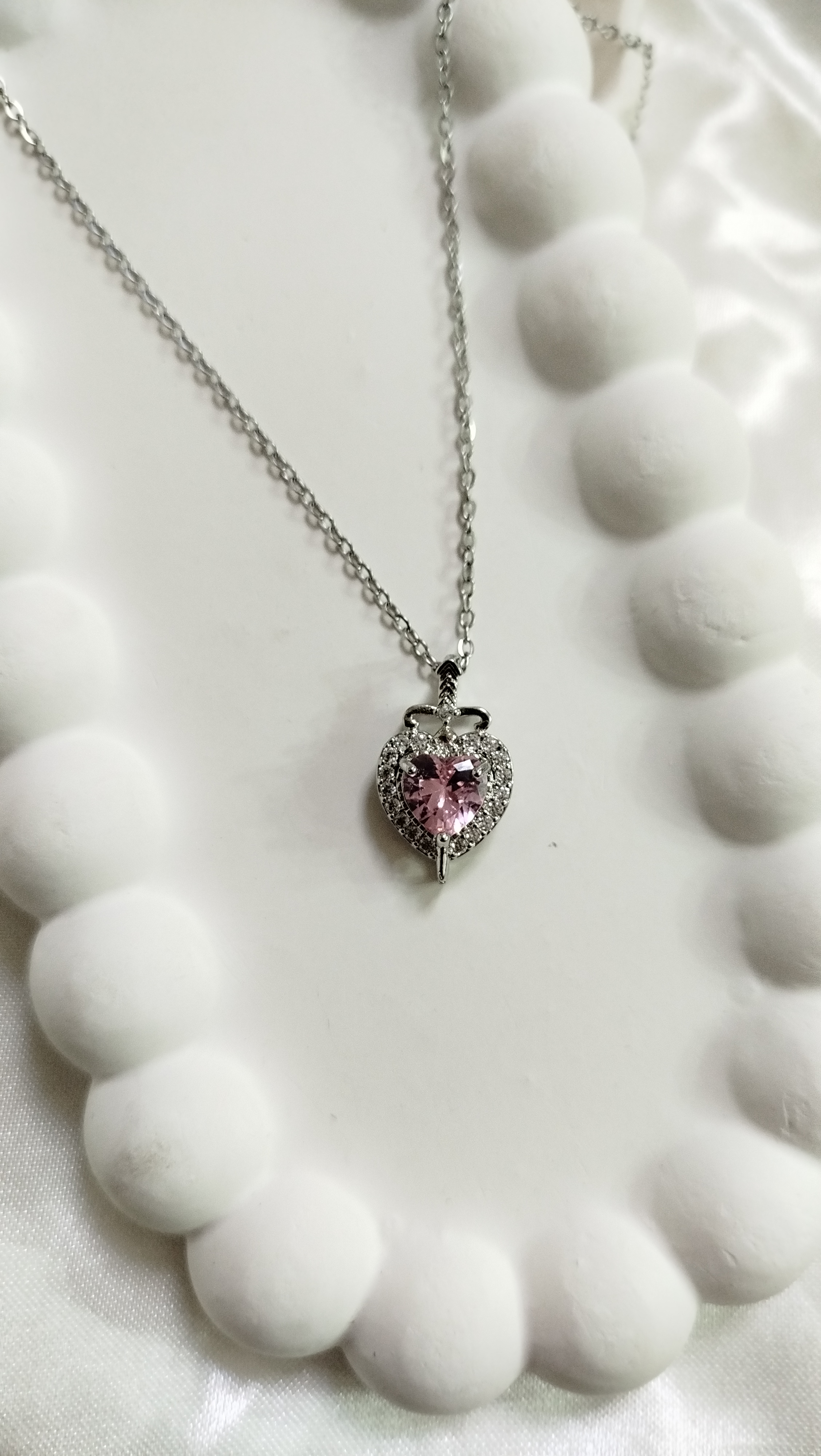 پلاک گردنبند شمشیر در قلب استیل نگین دار با نگین صورتی قلبی از برند سوارسکی اصل طرح مینیمال فانتزی پینترستی زنجیر دیپلمات استیل نقره‌ای