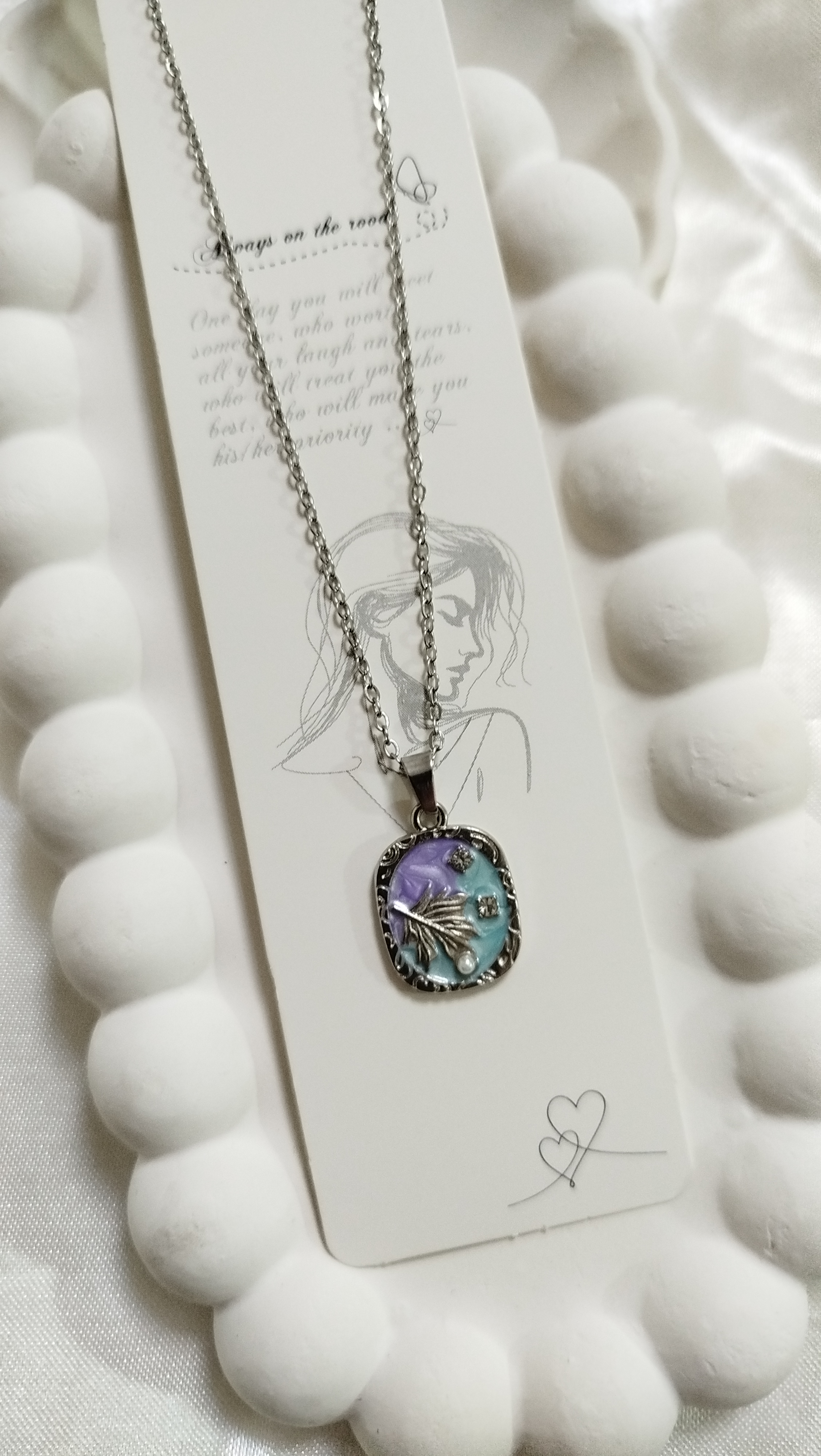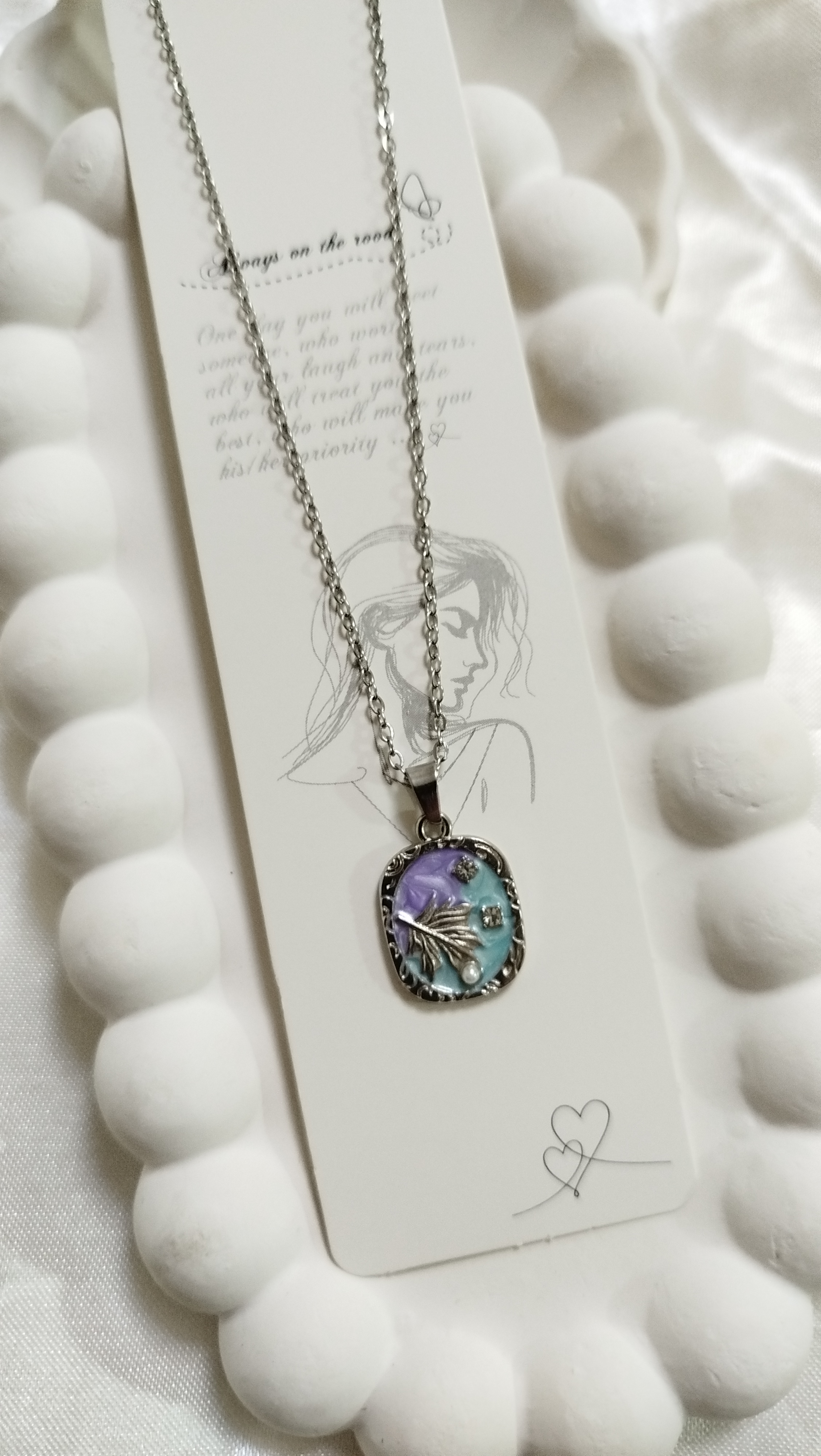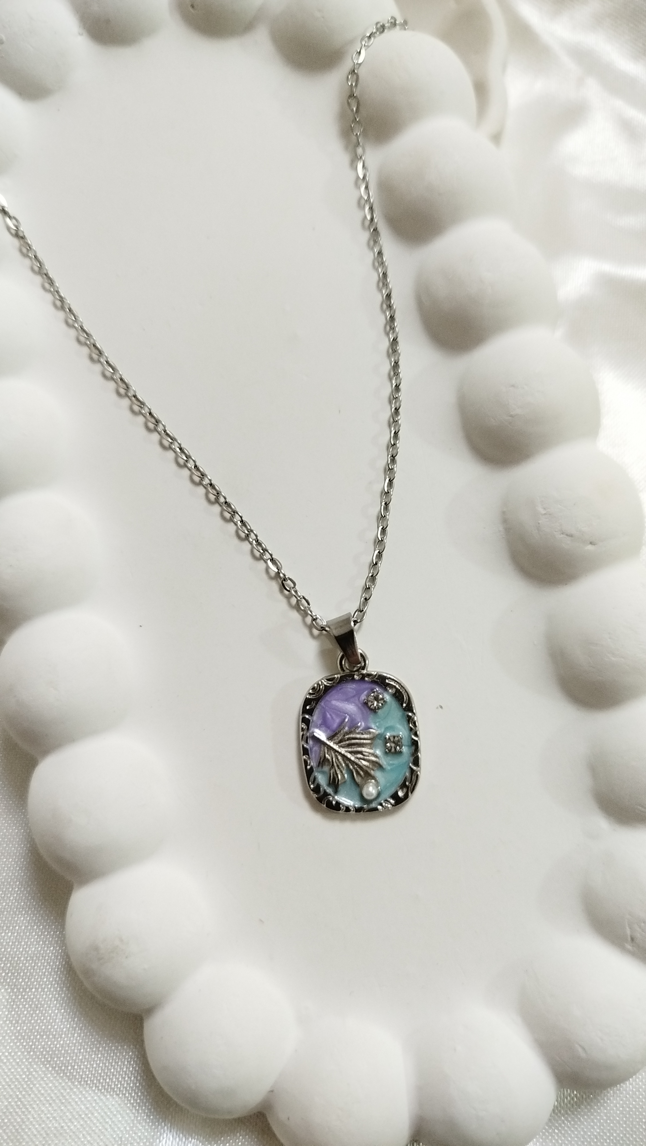 پلاک گردنبند میناکاری برگ بنفش فیروزه ای مدل کلاسیک هنری وینتیج زنجیر دیپلمات استیل نقره‌ای